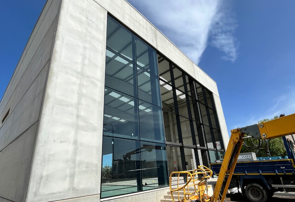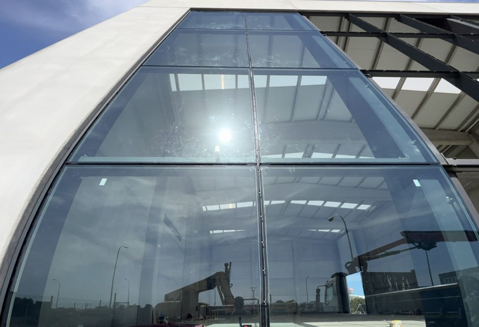Muro cortina WITEC 50SG de WICONA, fachada de vidrio estructural, sistema "all-glass" con cristal 6+6 SG41, y montantes de 276mm.